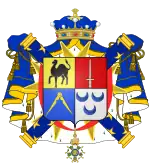 Écartélé; au premier d'or au dromadaire passant de sable; au deuxième des barons sortis de l'armée; au troisième d'azur au compas d'or posé en chevron alaisé; au quatrième d'argent chargé de trois croissants d'azur posées deux et un.[2],[3] |