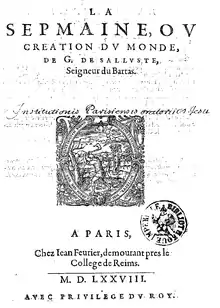 Il est surtout connu pour son poème encyclopédique « La Sepmaine (La Semaine) ou la Création du monde» (1578), œuvre inspirée par la Bible. Guillaume du Bartas s'y fait le défenseur des théories géocentriques et de l'astrologie judiciaire. Pour lui, le système de Copernic n'est qu'une chimère. Cette critique se fait au nom de l'encyclopédisme de la Renaissance[7] et de la foi, du Bartas ayant en vue de glorifier Dieu en proposant une lecture poétique du livre du monde.