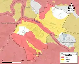 La commune est vulnérable au risque de mouvements de terrains constitué principalement du retrait-gonflement des sols argileux[28]. Cet aléa est susceptible d'engendrer des dommages importants aux bâtiments en cas d’alternance de périodes de sécheresse et de pluie. 86,9 % de la superficie communale est en aléa moyen ou fort (76,3 % au niveau départemental et 48,5 % au niveau national). Sur les 424 bâtiments dénombrés sur la commune en 2019, 400 sont en aléa moyen ou fort, soit 94 %, à comparer aux 90 % au niveau départemental et 54 % au niveau national. Une cartographie de l'exposition du territoire national au retrait gonflement des sols argileux est disponible sur le site du BRGM[29],[Carte 3].