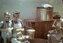 Deux femmes au travail dans la cuisine du kibboutz : à droite Nurit Refaeli et à gauche Deborah Rashbam avec son fils Amos