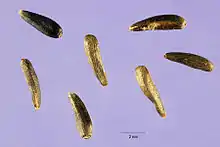 Les graines, en réalité des fruits, sont des akènes, en forme de massue, obovoïdes et étroitement longs, de 3 à 6 mm de long sur 1,5 à 4 mm de large, de couleur noire brillante avec des cicatrices blanches à jaunes sur le dessus et la base. Chaque capitule produit environ 40 à 50 graines[5].