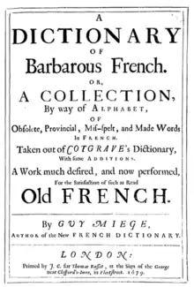 - Guy Miege, A new Dictionnary French and English..., Londres, (lire en ligne), : « It is now come to pass, that French Tongue is in a manner grown Universel in Europe, but especially amongst the Gentile part of it. » cité par Jean Pruvost, «Dictionnaires monolingues au double public depuis 1680 et dictionnaires culturels. », La linguistique 1/2012 (Vol. 48), p. 19-35