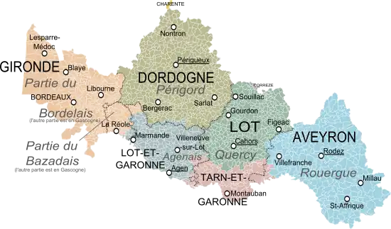 En 1790, la province de Guyenne est divisée en six départements à peu près complets : Gironde (à l'est de la Garonne), Dordogne, Lot-et-Garonne, Lot, Landes et Aveyron. À ceux-ci s'ajoutera le Tarn-et-Garonne, créé en 1808, et pour lequel la Guyenne contribuera pour les trois-quarts. Ce morcellement achèvera de détruire les derniers liens qui réunissaient la Basse-Guyenne, la Haute-Guyenne et la Gascogne.