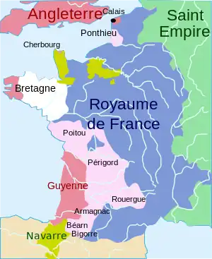 C'est en réponse à la saisie de la Guyenne prononcée par Philippe VI, qu'en , le roi d'Angleterre en réponse « défie » celui « qui se dit roi de France », et en tant que duc de Guyenne et comte de Ponthieu, rompt son lien de vassalité[3]. Le duché est finalement réunie au domaine du roi de France après la bataille de Castillon, qui mit fin à la guerre de Cent Ans. Donné en apanage à son frère Charles de Valois par Louis XI en 1469, il revint définitivement à la couronne française à la mort de celui-ci en 1472.