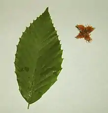 Les fruits sont de petites noix de 18 à 22 mm appelés faînes. Elles sont recouvertes dans un brou vert jaunâtre hérissé de pointes dont l'extrémité est teintée de rouge[1],[2].