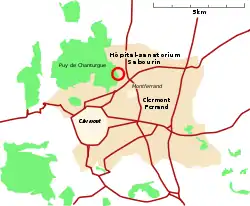 L'hôpital est installé sur les coteaux du puy de Chanturgue, à l'entrée nord de Clermont-Ferrand, rue du Docteur-Bousquet. Le terrain a été choisi dès 1929. Le choix du puy de Chanturgue (entre 362 et 391 mètres d’altitude) répondait aux critères de l'époque d'implantation des sanatoriums : protection contre les vents dominants, isolement dans la nature, possibilité de créer un parc clos et surveillé, ouverture sur le paysage, salubrité du terrain.