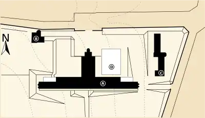 - Le bâtiment principal (A), surnommé « le paquebot » en raison de sa forme élancée sortie du flanc de la colline.