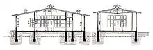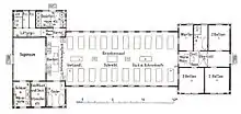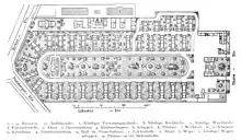 L'installation initiale en 1872 dans un système de baraquements corresponde à la conception de l'hygiène de l'époque. Les patients sont séparés en fonction de la nature des maladies et placés dans des groupes plus petits. En cas d'épidémie, cela permet d'éviter la propagation à d'autres patients. Les baraques sont constituées de simples colombages en bois, les constructions plus massives sont en maçonnerie avec des parements en briques, les parties structurantes sont créées en terre cuite. Ces méthodes de construction et la disposition des baraques en forme de fer à cheval régulier peuvent être classées, sur le plan architectural, dans la catégorie de l'éclectisme sobre[5]. Il ne reste plus aucune des baraques d'origine, car elles sont entièrement remplacées par des constructions en dur à partir de 1920.