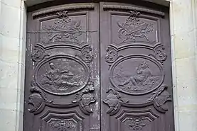 Sur les vantaux de sa porte en bois peint, sont sculptées les allégories de Mars et de Minerve.