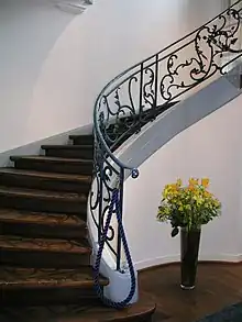 Le somptueux premier étage comportait à l'origine au moins huit grandes pièces et trois escaliers. L'escalier principal en colimaçon, à la rambarde en ferronnerie rococo, inchangé depuis la construction, permet d'accéder au second étage[2].