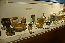 Vaisselles retrouvées dans les latrines- vaisselle culinaire : pots et pots ansés, pot tripode, fragments de caquelons, jattes ansées, couvercles en céramique, passoire, lèchefrite, ustensiles de cuisine,
