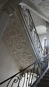 Cet escalier est très moderne pour son époque : il est construit en pierre, sans mur d'échiffre, ses volées appuyées sur des arcades qui retombent sur deux fins piliers de section carré et des culs-de-lampe. Les plafonds des volées, des repos et des paliers sont décorés d'entrelacs de bandes, de volutes, de rosaces et de feuillages sculptés. Les arcs diaphragmes et les culs-de-lampe sont eux aussi richement sculptés. L'escalier comporte un garde-corps en fer forgé au dessin sobre et élégant.