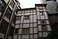 Le bâtiment possède une façade à pan de bois sur la rue et une arrière-cour.
