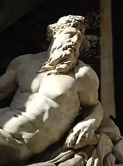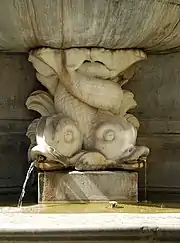 De part et d'autre de ce portail se dressent les statues des quatre Vertus cardinales : Prudentia (la Prudence) et Justitia (la Justice) à gauche, Fortitudo (la Force) et Temperantia (la Tempérance) à droite.