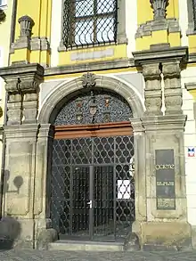 Le bâtiment de trois étages est surmonté d'une tour de l'horloge. Sur le côté droit, il y a une large entrée de cour voûtée et sur le côté gauche le portail voûté, encadré par des pilastres. Un portail en fer forgé avec un blason ferme l'entrée.