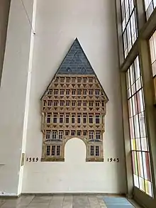 - Keramikwand mit dem Knochenhaueramtshaus am Eingang auf der Ostseite des Rathauses