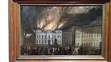 - « Le , les lampions utilisés pour illuminer la façade déclenchent un nouvel incendie. La Grande Salle est une seconde fois entièrement détruite, tout comme [de part et d'autre] les salons Henri IV [Pavillon nord-ouest] et Louis XIII [Pavillon sud-ouest] qui viennent, justement de faire l’objet de travaux »[14]