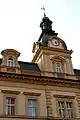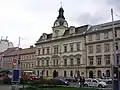 La conception de la façade du bâtiment et des locaux représentatifs a été commandée par l'architecte Josef Schulz. Au centre de la façade, au-dessus du toit, une tour avec un dôme, dans laquelle est placée une horloge circulaire, conçue par V. Krečmer. La tour, les sculptures, statues et sculptures ont été créées par le sculpteur Antonín Popp.