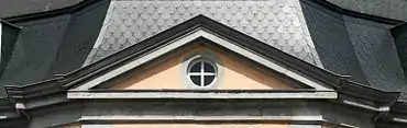 L'édifice est surmonté d'une toiture en combles à la Mansart couverte d'ardoises et percé de quatre lucarnes.