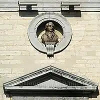 L'étage est orné de six hautes colonnes cannelées d'ordre corinthien[2] qui soutiennent un puissant entablement à frise de denticules dont l'architrave porte le millésime 1836 (MDCCCXXXVI)[1]. Toute la largeur de l'étage est occupée par un balcon à balustrade[1] sur lequel s'ouvrent cinq hautes portes-fenêtres dont l'encadrement de pierre est sommé d'un fronton triangulaire et d'un médaillon orné d'un buste. Chacune des façades latérales de cet avant-corps est pareillement ornée d'une balustrade, d'une porte-fenêtre, d'un fronton et d'un médaillon.