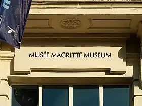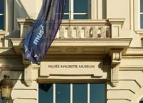 La façade de la place Royale est percée de deux grandes portes en bois surmontées chacune d'une fenêtre d'imposte quadripartite et d'un cartouche marqué « Musée Magritte Museum ». La fenêtre située au-dessus de chaque porte est précédée d'un balcon à balustrade de pierre soutenu par des consoles ornées de volutes et de feuilles d'acanthe.