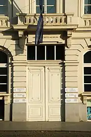 Au sud, le bâtiment est prolongé par un portique qui enjambe la rue du Musée et le relie à l'Hôtel des Brasseurs.