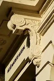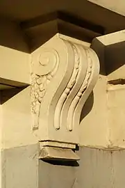 Le rez-de-chaussée est rythmé par une succession d'arcades cintrées à imposte et clé d'arc à perles et volutes, séparées par une maçonnerie à bossages plats et à lignes de refend. Autour de l'arc des arcades, les bossages adoptent un profil rayonnant, typique de l'architecture néo-classique. Dans chaque baie cintrée est inscrite une fenêtre à arc surbaissé possédant un appui de fenêtre supporté par deux corbeaux à motif de gouttes et rudentures.