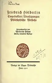 Au chapitre de la réception philosophique de Hölderlin à partir du XXe siècle, Isabelle Kalinowski observe comment de nombreux interprètes ont notamment décrit l'évolution de l'écrivain dans la période qui aboutit à la publication des traductions de l' Œdipe roi et de l' Antigone de Sophocle, traductions qui « suscitèrent les sarcasmes de leurs premiers lecteurs, surpris par la violence de leur littéralité » et sont célébrées aujourd'hui, depuis Nietzsche et Walter Benjamin, « comme une intuition géniale de “l'archaïsme primitif” qui continua de sous-tendre la Grèce classique »[22]. Françoise Dastur fait pour sa part un rapprochement de l'apparition du « médiateur » dans la période déjà plus tardive d' Empédocle chez Hölderlin avec l'idée au vingtième siècle du « dernier homme » de Nietzsche[N 6],[23].