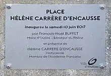 - Une place Hélène-Carrère-d'Encausse est inaugurée à Oullins (métropole de Lyon) en 2017[87].