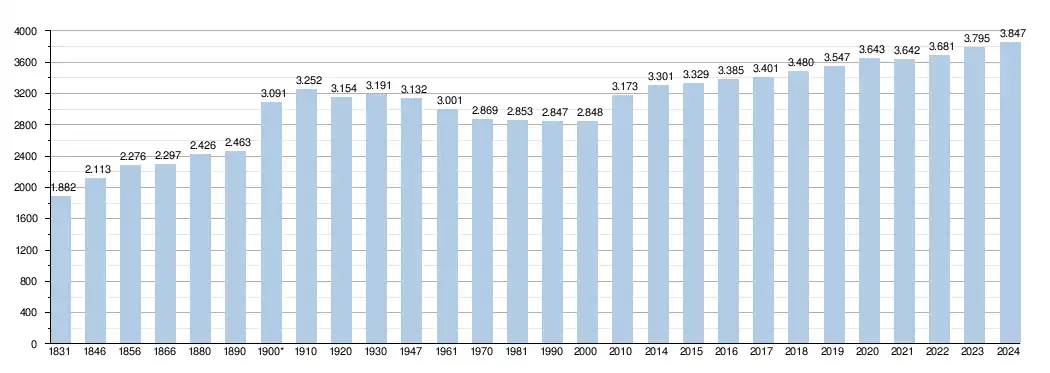 Elle comptait, au , 3 837 habitants (1 908 hommes et 1 929 femmes), soit une densité de 225,97 habitants/km²[6] pour une superficie de 16,98 km².