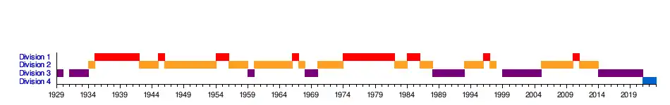Le club évolue également pendant 43 saisons en deuxième division. La dernière présence du club en deuxième division remonte à la saison 2013-2014.