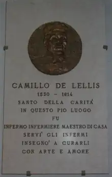 Dans la seconde partie du XVIe siècle, parmi les patients de l'hôpital se trouve également le futur saint Camille de Lellis, hospitalisé pour la première fois en 1571 en raison d'une escarre à la jambe droite[20]. Après une amélioration de sa blessure, il est d'abord embauché dans la structure comme garçon, mais est ensuite licencié pour faute grave[21] : à l'époque, il n'est pas rare que le personnel hospitalier, mal payé et en rotation constante, adopte des comportements incorrects[22]. Converti, de Lellis revient à Rome en 1575 pour une nouvelle hospitalisation à San Giacomo, mais cette fois il reste dans la « famille hospitalière » et commence à travailler avec enthousiasme, devenant « maître de maison » et trésorier en 1579[23] : il améliore l'organisation du personnel, posant les bases du service de soins infirmiers et d'assistance sanitaire dans les hôpitaux, créant la figure du « religieux-infirmier » qui soigne les malades « non pas pour un salaire, mais volontairement et par amour de Dieu »[24], et promulguant les Regole per ben servire gli infermi (Règles pour bien servir les malades), conçues et appliquées pour la première fois à San Giacomo entre 1584 et 1585[25]. Toujours à San Giacomo, en août 1582, de Lellis fonde la « Compagnie des ministres des malades », élevée plus tard par le pape Grégoire XIV en Ordre des Clercs réguliers pour les malades par une bulle de 1591. Plus tard, Camille est sanctifié par l'Église catholique et désigné comme le saint patron des malades et du personnel hospitalier.