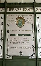 - la plaque centrale mentionne sa qualité de « compagnie anglaise d'assurances sur la vie », sa date de création (1848), sa date d'établissement en Belgique (1855), et la liste des sièges de succursales qui étaient propriété de la compagnie;