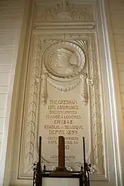 Dans le hall d'entrée, chacune des plaques de marbre centrales est ornée d'un portrait de sir Thomas Gresham (1519 - 1579), marchand anglais, conseiller financier du roi Édouard VI d'Angleterre et fondateur du Royal Exchange, qui donna son nom à la Gresham Street près de laquelle se situait le siège londonien de la Gresham Life Assurance Society Limited.