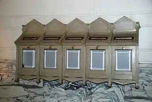 Dans le vestibule du fond se trouve une rangée de cinq boîtes aux lettres de style Art nouveau.
