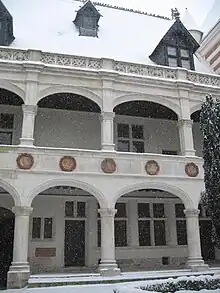 L'influence italienne apparaît cependant moins dans l'architecture elle-même que dans la mouluration et les sculptures (candélabres, etc.) qui ornent les portes de l'escalier ou les chapiteaux des piliers (oiseaux affrontés, etc.). La finesse de ces motifs donne d'ailleurs à penser qu'ils ont pu être réalisés par des artistes originaires d'Italie[4].
