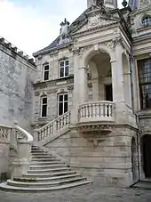 L’escalier d'honneur actuel est la troisième version. L'escalier primitif était en fer à cheval surmonté d'un baldaquin. L'ingénieur Claude Masse disait de cet escalier « C'est une espèce de fer à cheval mal construit et trop raide... »[MAS 3]. En 1612, on installe sous le baldaquin une statue du « bien bon ami des Rochelais »[44],[45], Henri IV. Cette statue, en terre cuite, peinte, représente Henri IV grandeur nature, en costume de guerre, revêtu d'une cuirasse, la tête nue, la main gauche sur la garde de son épée, et la droite appuyée sur un bâton de commandement[MAS 4],[MAS 3]. Outre la statue détruite lors de la Révolution, l'escalier s'écroula en 1812. En 1815, il est rebâti[46],[47] par Antoine Brossard, architecte de la commune. De style néoclassique, il s'harmonise mal avec le reste de la façade de style Renaissance et occupe un large espace de la cour[48]. Un nouvel escalier est conçu par J. Lisch plus en harmonie avec la façade de style Renaissance qui est réalisé au cours de la restauration du bâtiment à la fin du XIXe siècle[MFD 8]. Beaucoup plus petit et implanté devant le pavillon Nord, il permet un agrandissement de la façade principale avec l'ajout de deux nouvelles travées[PC 2]. L'escalier de l'architecte Juste Lisch comporte un baldaquin où est installée une statue du roi Henri IV en faïence polychrome de Théodore Deck[MFD 8].