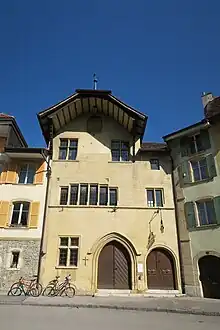 Il faut attendre le XVe siècle pour voir la construction d'une chapelle et d'un hôtel de ville au sud-est du bourg. Pour développer la ville, Jean de Fribourg[9] offre aux bourgeois du Landeron un terrain équivalant à la surface de trois maisons afin d'y construire un bâtiment aux multiples fonctions, ce qui lui confère une configuration unique dans la région. Le rez-de-chaussée est occupé par la Chapelle des Dix Mille Martyrs d'Arménie, ainsi appelée en référence au récit martyrologique de soldats romains convertis au christianisme et crucifiés au Mont Ararat. La Chapelle est consacrée en 1455 alors que le chantier se poursuit les années suivantes pour établir les locaux nécessaires aux étages supérieurs.