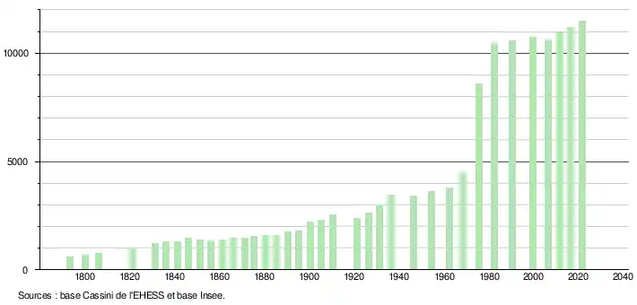 - Par convention dans Wikipédia, le principe a été retenu de n’afficher dans le tableau des recensements et le graphique, pour les populations légales postérieures à 1999, que les populations correspondant à une enquête exhaustive de recensement pour les communes de moins de 10 000 habitants, et que les populations des années 2006, 2011, 2016, etc. pour les communes de plus de 10 000 habitants, ainsi que la dernière population légale publiée par l’Insee pour l'ensemble des communes.