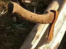 Les premières haches étaient formées d'une pierre taillée insérée entre deux planches de bois serrées l'une contre l'autre avec une corde, qui servait également à faire tenir la lame en place.