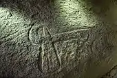 - Les formes de ces haches sont schématisées : le manche se réduit à un trait et la lame à un second trait subperpendiculaire au premier, ce qui aboutit à des haches symbolisées par un « chiffre 7 » et une simple croix asymétrique. Cf Marthe Péquart, Saint-Just Victor Péquart, Zacharie Le Rouzic, Corpus des signes gravés des monuments mégalithiques du Morbihan, A. Picard, , p. 42-46.