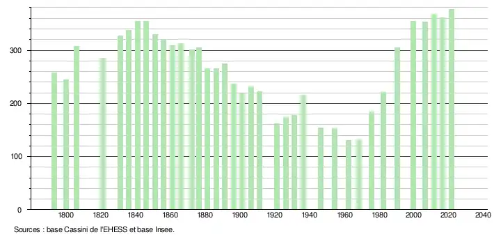 L'évolution du nombre d'habitants est connue à travers les recensements de la population effectués dans la commune depuis 1793. Pour les communes de moins de 10 000 habitants, une enquête de recensement portant sur toute la population est réalisée tous les cinq ans, les populations légales des années intermédiaires étant quant à elles estimées par interpolation ou extrapolation[26]. Pour la commune, le premier recensement exhaustif entrant dans le cadre du nouveau dispositif a été réalisé en 2006[27].