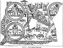 Dans l'église du VIe siècle, la croix est représentée au sol des fronts baptismaux, rouge, à bouts évasés avec deux feuilles et les lettres A et à côté des bras. Cette représentation ignore Théodose II qui en l'an 427 interdit de figurer la Croix sur le sol. Elle doit être figurée dans les portions les plus honorables des édifices de culte. Cette interdiction est maintenue sous le règne de Valentinien III (419-455)[3].