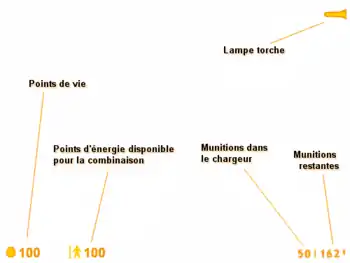 Une interface est affichée à l'écran pendant le jeu. Celle-ci est composée de différents éléments répartis sur la périphérie de l'écran. Dans le coin supérieur droit se trouve une lampe torche qui s'allume lorsque celle-ci est activée. En bas de l'écran, le joueur peut voir ses points de vie, ses points d'énergie disponible pour la combinaison de protection en milieu hostile que porte le personnage qu'il incarne et ses munitions restantes.