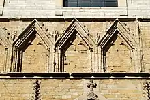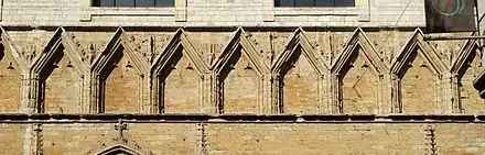Au-dessus de ces portails et fenêtres court une large frise de niches surmontées d'arcs en mitre qui alternent avec des pinacles, et dans lesquelles sont inscrits des arc trilobés ogivaux[3].