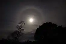Il existe un autre phénomène optique similaire appelé couronne, provenant de la diffraction de la lumière à travers des nuages minces ou une zone de gouttelettes de pluie, qui est plus coloré que le petit halo et de plus faible ouverture angulaire[2],[3].
