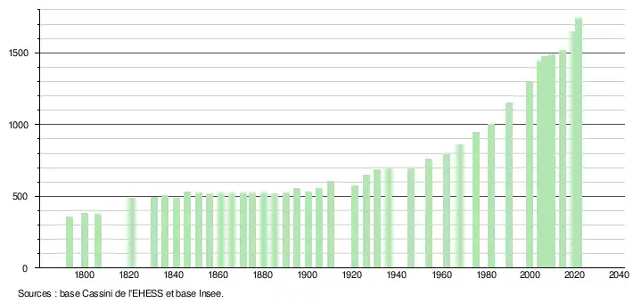 L'évolution du nombre d'habitants est connue à travers les recensements de la population effectués dans la commune depuis 1793. Pour les communes de moins de 10 000 habitants, une enquête de recensement portant sur toute la population est réalisée tous les cinq ans, les populations légales des années intermédiaires étant quant à elles estimées par interpolation ou extrapolation[21]. Pour la commune, le premier recensement exhaustif entrant dans le cadre du nouveau dispositif a été réalisé en 2004[22].