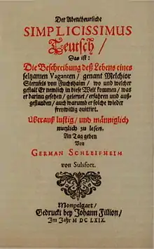 L'année suivante, en 1668, von Grimmelshausen publie à Nuremberg, sous le pseudonyme de German Schleifheim[Note 1], Der Abenteuerliche Simplicissimus Teutsch, Das ist die Beschreibung des Lebens eines seltsamen Vaganten, genannt Melchior Sterfels von Fuchsheim[Note 2], connu en français sous le titre Les Aventures de Simplicius Simplicissimus, et considéré comme un des grands romans du dix-septième siècle[2]. Cette première édition de 1668 n'a pas été conservée, et l'ouvrage nous est connu par son édition de 1669[2].