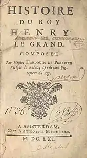 Autant sa réputation d'intransigeance paraît solidement établie — c'est lui qui fait interdire le Tartuffe de Molière dès le lendemain de sa première représentation publique au théâtre du Palais-Royal en 1667[3] — autant Hardouin de Péréfixe continue à jouir toute sa vie de la faveur de Louis XIV. Après avoir composé pour le jeune roi un recueil de maximes latines en 1647, il rédige à son intention une Histoire du roy Henry le Grand[4] qui paraît en 1661. L'ouvrage connaît un très grand nombre d'éditions et est traduit dans plusieurs langues. Il fixe notamment la formule attribuée à Henri IV sur le champ de bataille d'Ivry « Ralliez-vous à mon panache blanc, vous le trouverez toujours au chemin de la victoire et de l'honneur. ».
