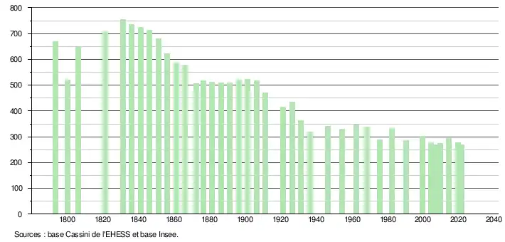 L'évolution du nombre d'habitants est connue à travers les recensements de la population effectués dans la commune depuis 1793. Pour les communes de moins de 10 000 habitants, une enquête de recensement portant sur toute la population est réalisée tous les cinq ans, les populations légales des années intermédiaires étant quant à elles estimées par interpolation ou extrapolation[14]. Pour la commune, le premier recensement exhaustif entrant dans le cadre du nouveau dispositif a été réalisé en 2004[15].